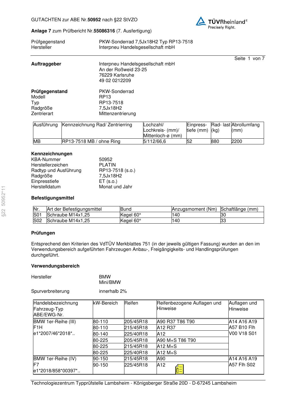 Dieses Gutachten (ABE) bezieht sich auf die Alufelge Platin P70 in der Ausführung 7.5Jx18 ET 0, Mittenloch 0 mm (KBA 50952). Im PDF findest du typischerweise zulässige Reifengrößen, Auflagen/Anbauhinweise und – je nach Dokument – Hinweise zur Eintragung.