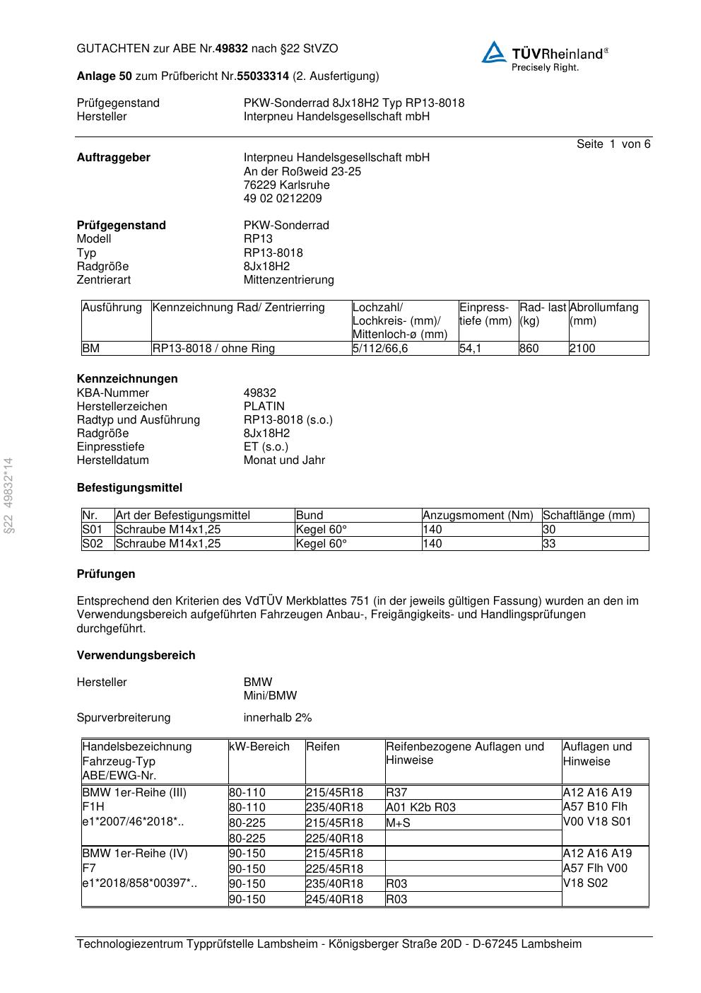 Dieses Gutachten (ABE) bezieht sich auf die Alufelge Platin P70 in der Ausführung 8Jx18 ET 0, Mittenloch 0 mm (KBA 49832). Im PDF findest du typischerweise zulässige Reifengrößen, Auflagen/Anbauhinweise und – je nach Dokument – Hinweise zur Eintragung.