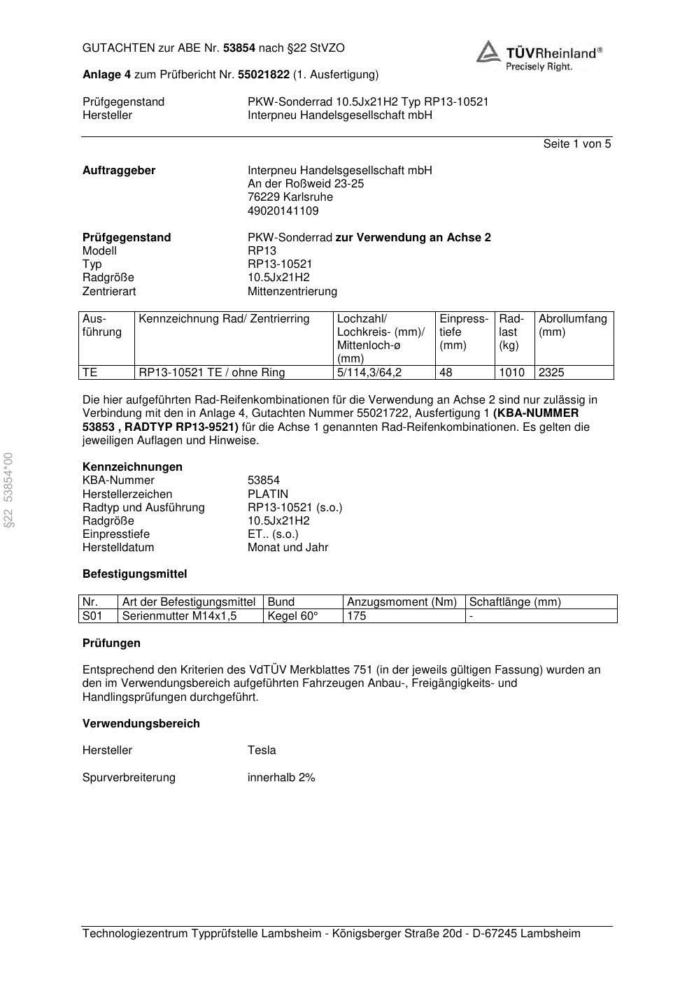 Dieses Gutachten (ABE) bezieht sich auf die Alufelge Platin P70 in der Ausführung 10.5Jx21 ET 0, Mittenloch 0 mm (KBA 53854). Im PDF findest du typischerweise zulässige Reifengrößen, Auflagen/Anbauhinweise und – je nach Dokument – Hinweise zur Eintragung.