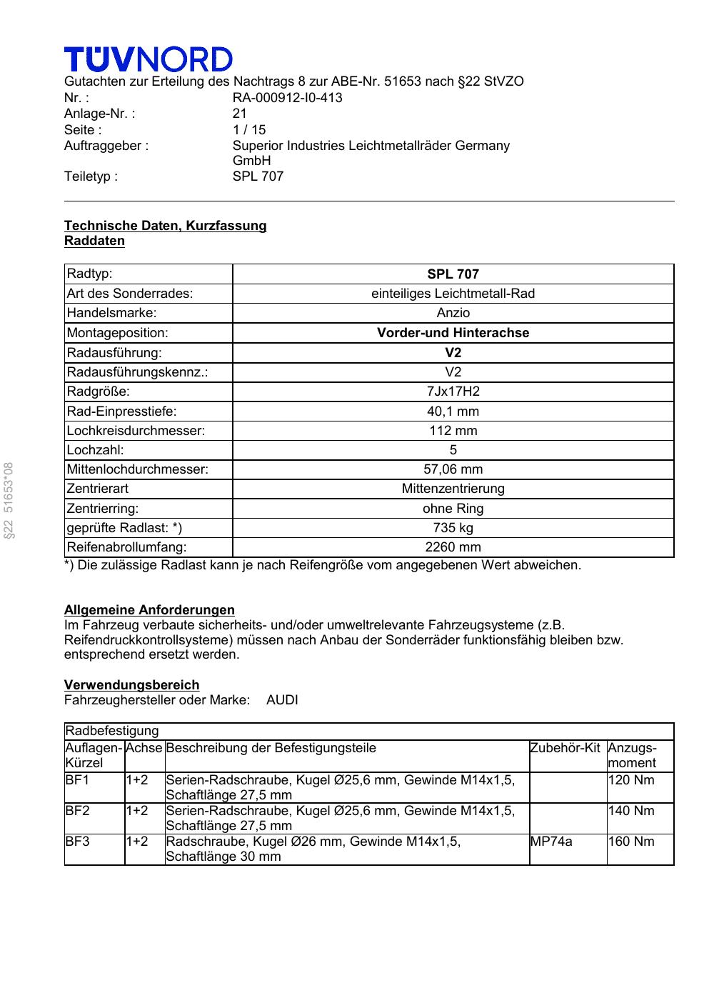 Felgengutachten / ABE für Alufelgen Platin P73 (7Jx17 ET 0, Mittenloch 0 mm) mit KBA 51653 (Zertifikatsnummer RA-000912-I0-413-21). Hier kostenlos als PDF herunterladen. Der Download-Link ist 24 Stunden gültig und kann bis zu zwei Mal verwendet werden.