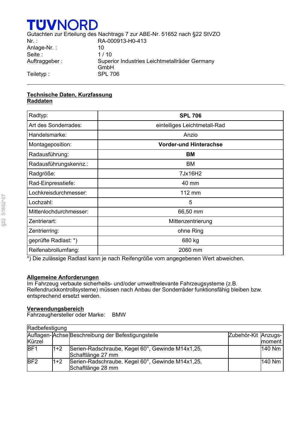 Felgengutachten / ABE für Alufelgen Platin P73 (7Jx16 ET 0, Mittenloch 0 mm) mit KBA 51652 (Zertifikatsnummer RA-000913-H0-413-10). Hier kostenlos als PDF herunterladen. Der Download-Link ist 24 Stunden gültig und kann bis zu zwei Mal verwendet werden.