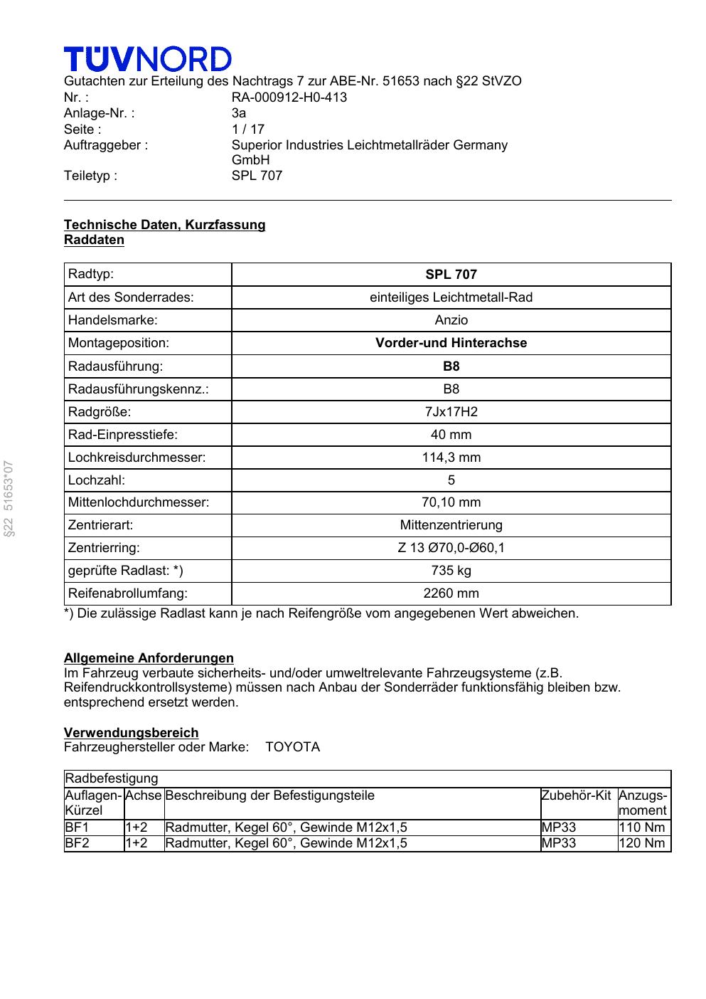 Felgengutachten / ABE für Alufelgen Platin P73 (7Jx17 ET 0, Mittenloch 0 mm) mit KBA 51653 (Zertifikatsnummer RA-000912-H0-413-3a). Hier kostenlos als PDF herunterladen. Der Download-Link ist 24 Stunden gültig und kann bis zu zwei Mal verwendet werden.