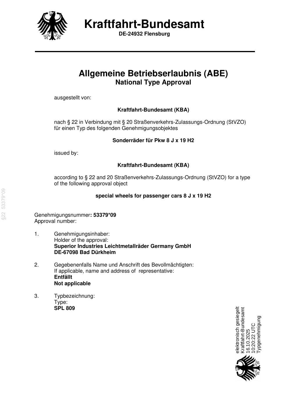 Dieses Gutachten (ABE) bezieht sich auf die Alufelge Platin P73 in der Ausführung 8Jx19 ET 0, Mittenloch 0 mm (KBA 53379). Im PDF findest du typischerweise zulässige Reifengrößen, Auflagen/Anbauhinweise und – je nach Dokument – Hinweise zur Eintragung.