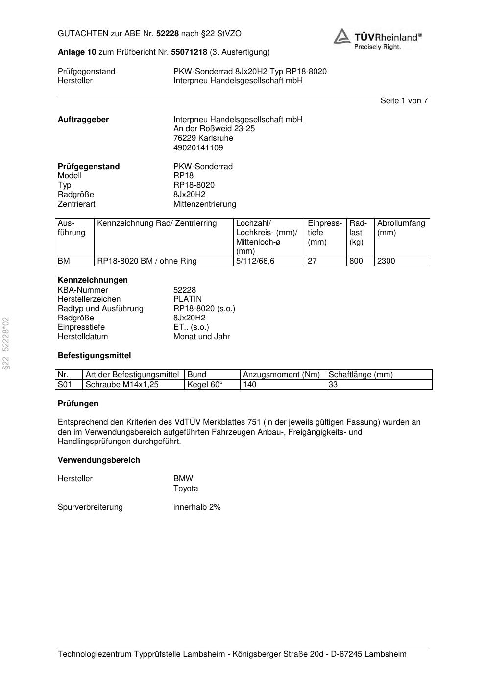 Dieses Gutachten (ABE) bezieht sich auf die Alufelge Platin P91 in der Ausführung 8Jx2 ET 0, Mittenloch 0 mm (KBA 52228). Im PDF findest du typischerweise zulässige Reifengrößen, Auflagen/Anbauhinweise und – je nach Dokument – Hinweise zur Eintragung.