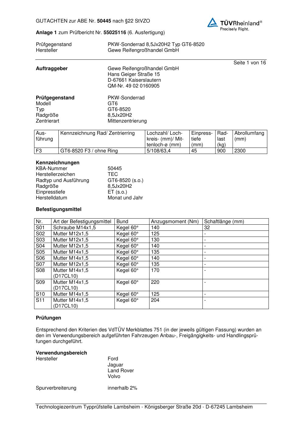Dieses Gutachten (ABE) bezieht sich auf die Alufelge Platin P94 in der Ausführung 8.5Jx2 ET 0, Mittenloch 0 mm (KBA 50445). Im PDF findest du typischerweise zulässige Reifengrößen, Auflagen/Anbauhinweise und – je nach Dokument – Hinweise zur Eintragung.