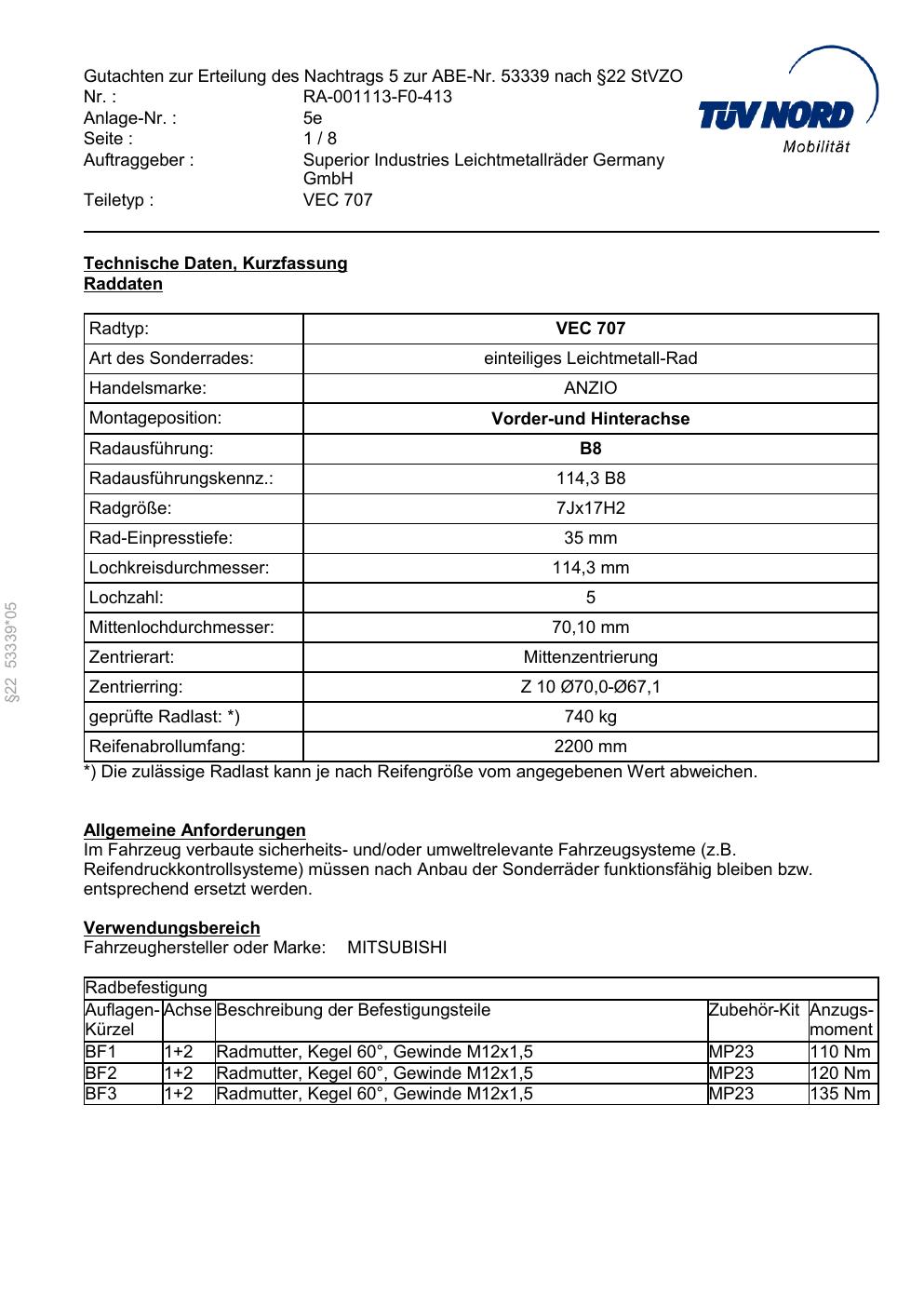 Dieses Gutachten (ABE) bezieht sich auf die Alufelge Platin P95 in der Ausführung 7Jx17 ET 0, Mittenloch 0 mm (KBA 53339). Im PDF findest du typischerweise zulässige Reifengrößen, Auflagen/Anbauhinweise und – je nach Dokument – Hinweise zur Eintragung.