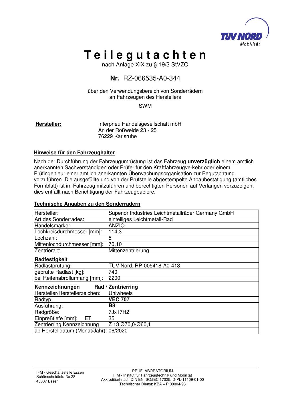 Dieses Gutachten (ABE) bezieht sich auf die Alufelge Platin P95 in der Ausführung 7Jx17 ET 0, Mittenloch 0 mm (KBA 53339). Im PDF findest du typischerweise zulässige Reifengrößen, Auflagen/Anbauhinweise und – je nach Dokument – Hinweise zur Eintragung.