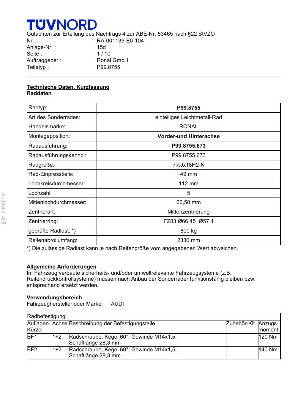 Felgengutachten / ABE für Alufelgen Platin P99 (7.5Jx18 ET 0, Mittenloch 0 mm) mit KBA 53465 (Zertifikatsnummer RA-001139-E0-104-15d). Hier kostenlos als PDF herunterladen. Der Download-Link ist 24 Stunden gültig und kann bis zu zwei Mal verwendet werden.
