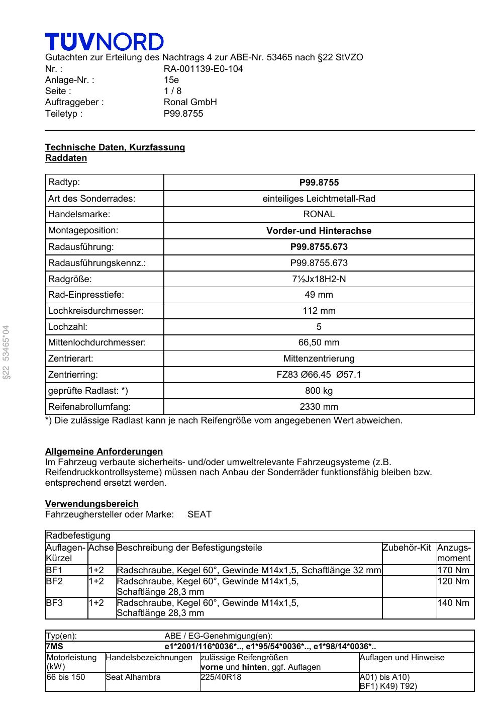 Dieses Gutachten (ABE) bezieht sich auf die Alufelge Platin P99 in der Ausführung 7.5Jx18 ET 0, Mittenloch 0 mm (KBA 53465). Im PDF findest du typischerweise zulässige Reifengrößen, Auflagen/Anbauhinweise und – je nach Dokument – Hinweise zur Eintragung.