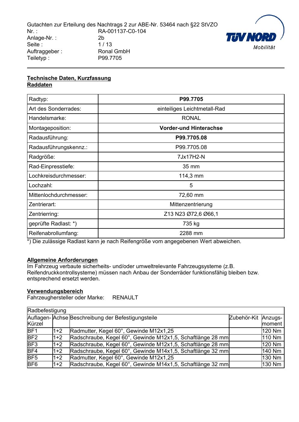 Dieses Gutachten (ABE) bezieht sich auf die Alufelge Platin P99 in der Ausführung 7Jx17 ET 0, Mittenloch 0 mm (KBA 53464). Im PDF findest du typischerweise zulässige Reifengrößen, Auflagen/Anbauhinweise und – je nach Dokument – Hinweise zur Eintragung.