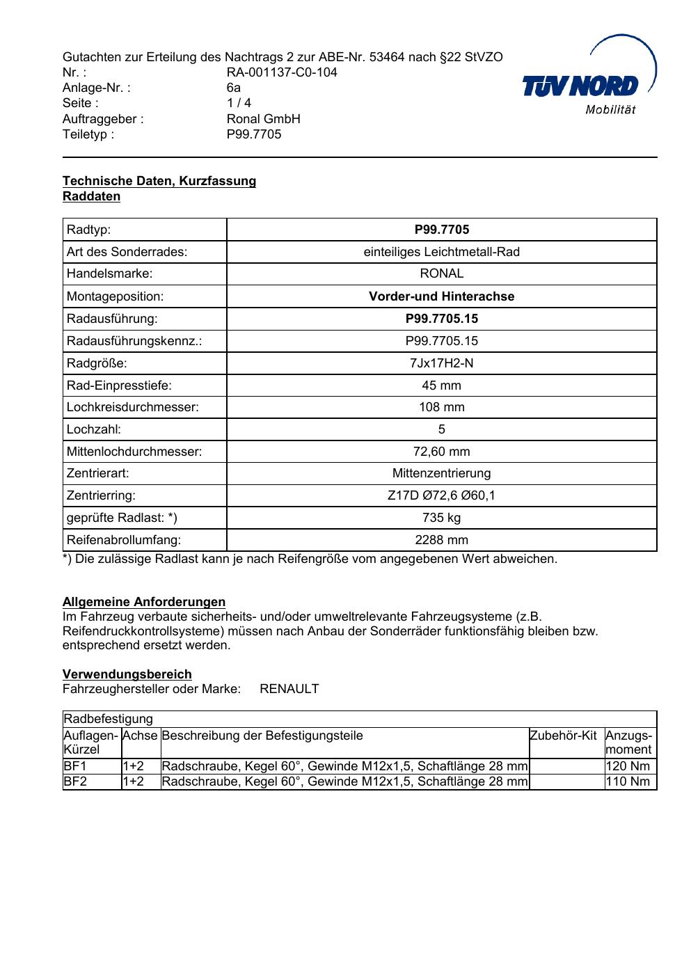 Felgengutachten / ABE für Alufelgen Platin P99 (7Jx17 ET 0, Mittenloch 0 mm) mit KBA 53464 (Zertifikatsnummer RA-001137-C0-104-06a-RE-5-108-60-ET45). Hier kostenlos als PDF herunterladen. Der Download-Link ist 24 Stunden gültig und kann bis zu zwei Mal verwendet werden.