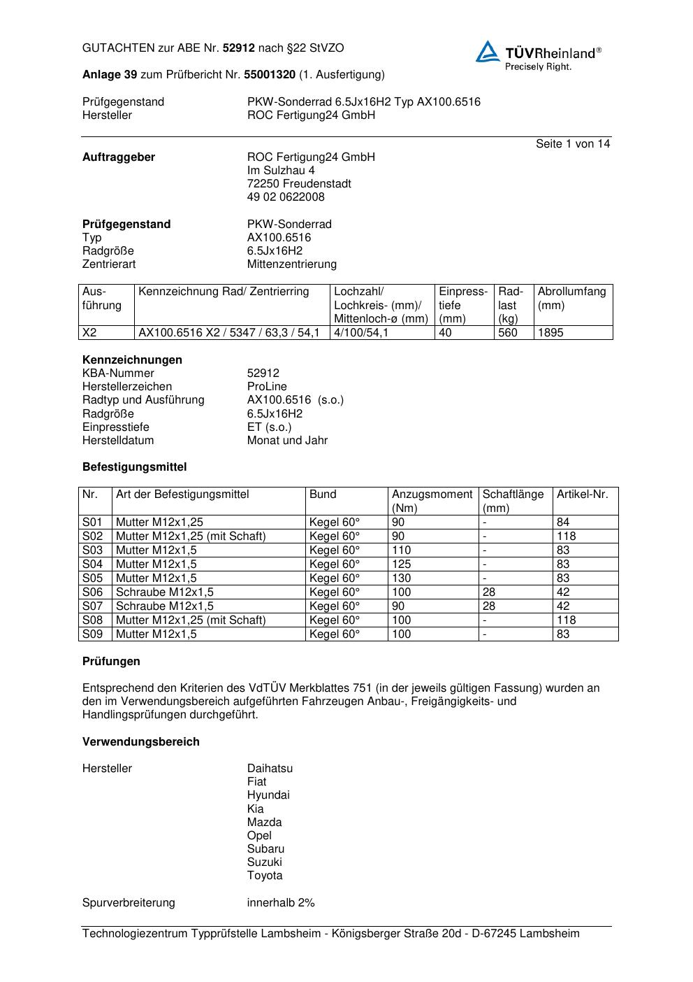 Dieses Gutachten (ABE) bezieht sich auf die Alufelge Proline AX100.65 in der Ausführung 6.5Jx16 ET 0, Mittenloch 0 mm (KBA 52912). Im PDF findest du typischerweise zulässige Reifengrößen, Auflagen/Anbauhinweise und – je nach Dokument – Hinweise zur Eintragung.