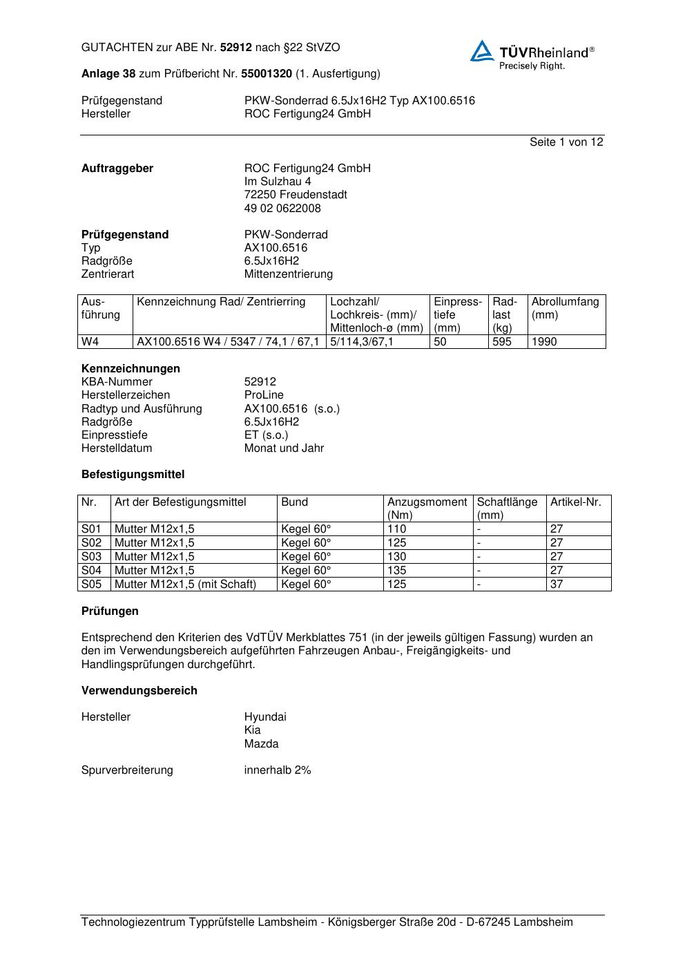Dieses Gutachten (ABE) bezieht sich auf die Alufelge Proline AX100.65 in der Ausführung 6.5Jx16 ET 0, Mittenloch 0 mm (KBA 52912). Im PDF findest du typischerweise zulässige Reifengrößen, Auflagen/Anbauhinweise und – je nach Dokument – Hinweise zur Eintragung.