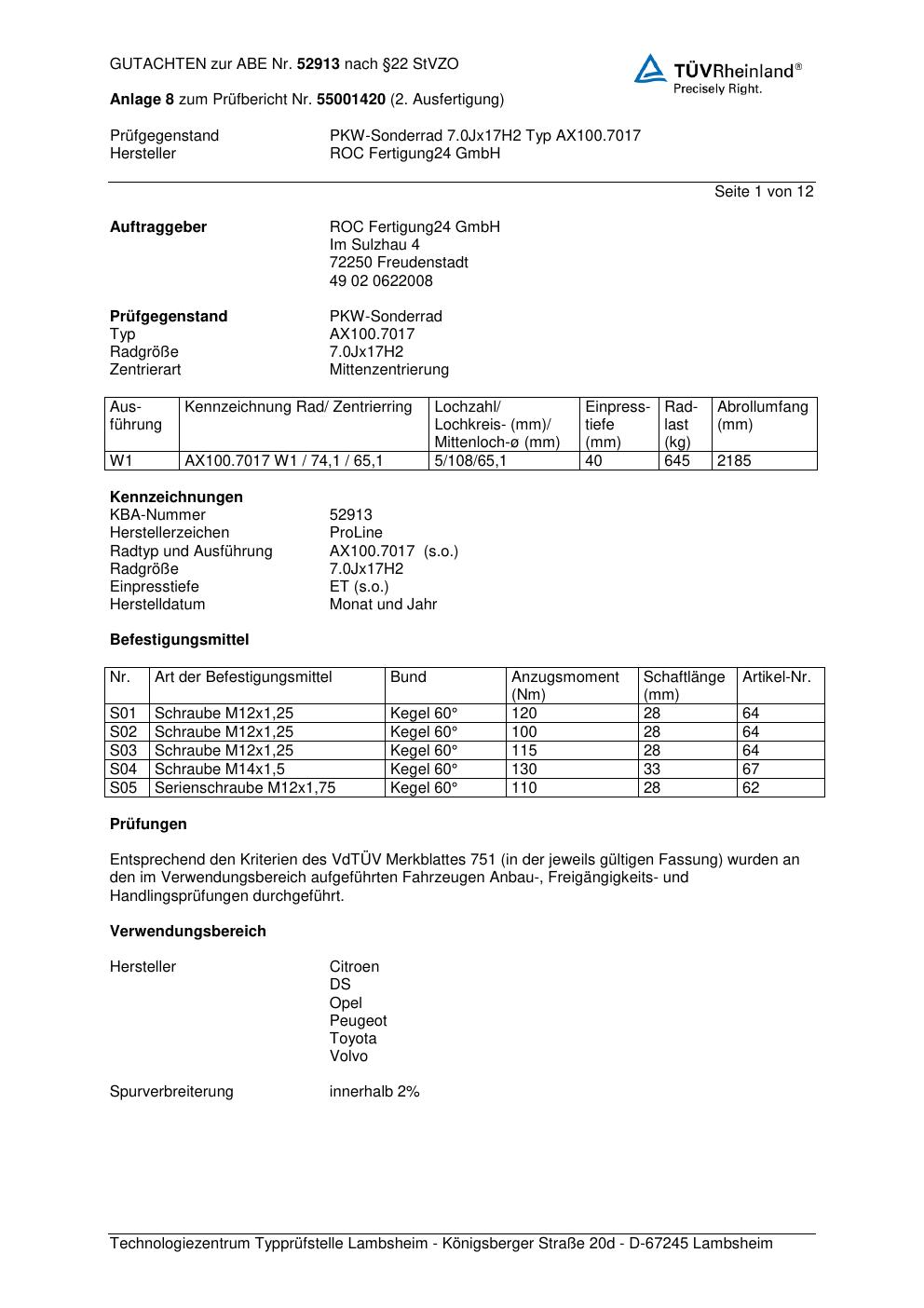 Dieses Gutachten (ABE) bezieht sich auf die Alufelge Proline AX100.7017 in der Ausführung 7Jx17 ET 0, Mittenloch 0 mm (KBA 52913). Im PDF findest du typischerweise zulässige Reifengrößen, Auflagen/Anbauhinweise und – je nach Dokument – Hinweise zur Eintragung.