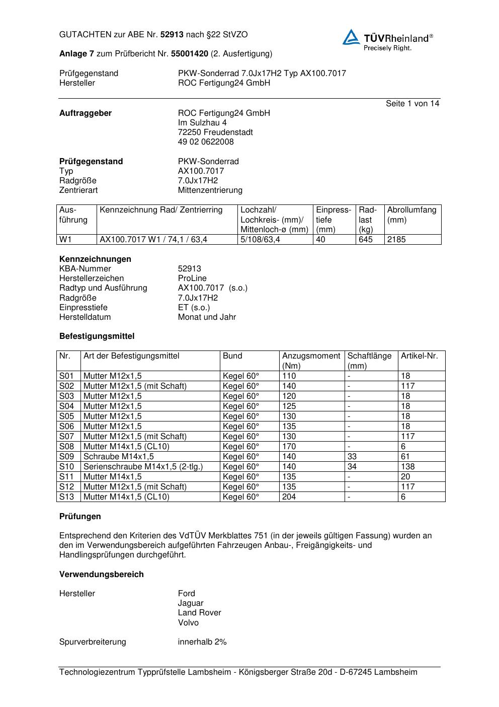 Dieses Gutachten (ABE) bezieht sich auf die Alufelge Proline AX100.7017 in der Ausführung 7Jx17 ET 0, Mittenloch 0 mm (KBA 52913). Im PDF findest du typischerweise zulässige Reifengrößen, Auflagen/Anbauhinweise und – je nach Dokument – Hinweise zur Eintragung.