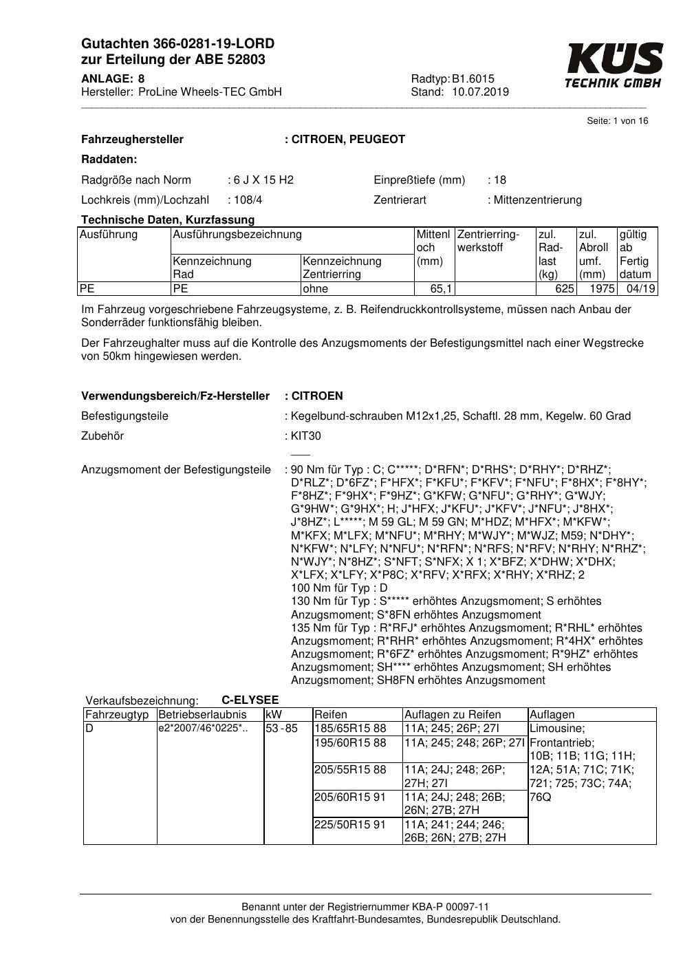 Dieses Gutachten (ABE) bezieht sich auf die Alufelge Proline B1.6015 in der Ausführung 6Jx15 ET 0, Mittenloch 0 mm (KBA 52803). Im PDF findest du typischerweise zulässige Reifengrößen, Auflagen/Anbauhinweise und – je nach Dokument – Hinweise zur Eintragung.
