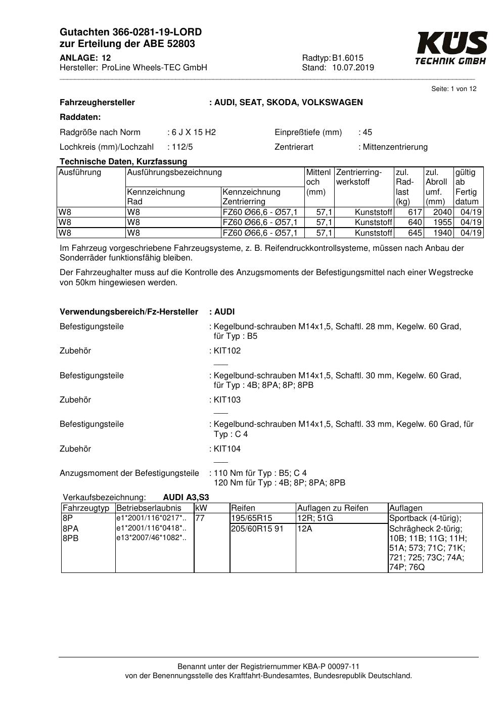 Felgengutachten / ABE für Alufelgen Proline B1.6015 (6Jx15 ET 0, Mittenloch 0 mm) mit KBA 52803 (Zertifikatsnummer KBA 52803). Hier kostenlos als PDF herunterladen. Der Download-Link ist 24 Stunden gültig und kann bis zu zwei Mal verwendet werden.