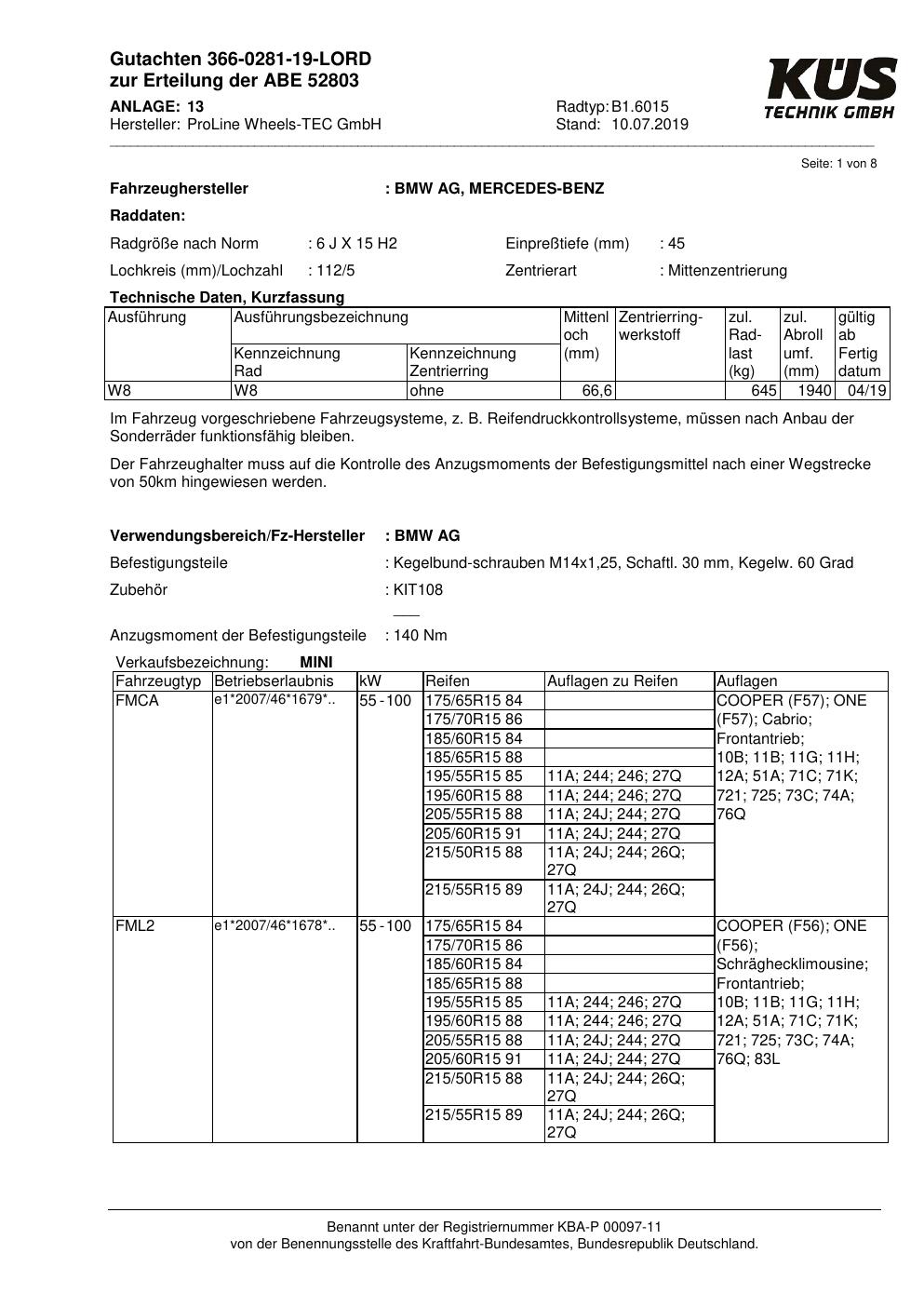 Felgengutachten / ABE für Alufelgen Proline B1.6015 (6Jx15 ET 0, Mittenloch 0 mm) mit KBA 52803 (Zertifikatsnummer KBA 52803). Hier kostenlos als PDF herunterladen. Der Download-Link ist 24 Stunden gültig und kann bis zu zwei Mal verwendet werden.