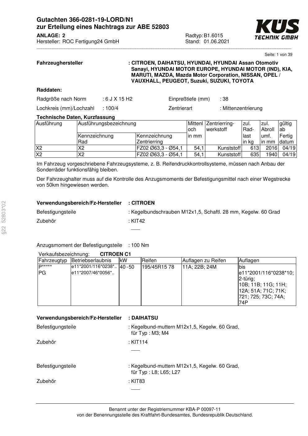 Felgengutachten / ABE für Alufelgen Proline B1.6015 (6Jx15 ET 0, Mittenloch 0 mm) mit KBA 52803 (Zertifikatsnummer KBA 52803). Hier kostenlos als PDF herunterladen. Der Download-Link ist 24 Stunden gültig und kann bis zu zwei Mal verwendet werden.