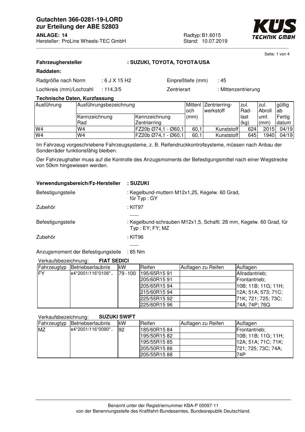 Felgengutachten / ABE für Alufelgen Proline B1.6015 (6Jx15 ET 0, Mittenloch 0 mm) mit KBA 52803 (Zertifikatsnummer KBA 52803). Hier kostenlos als PDF herunterladen. Der Download-Link ist 24 Stunden gültig und kann bis zu zwei Mal verwendet werden.