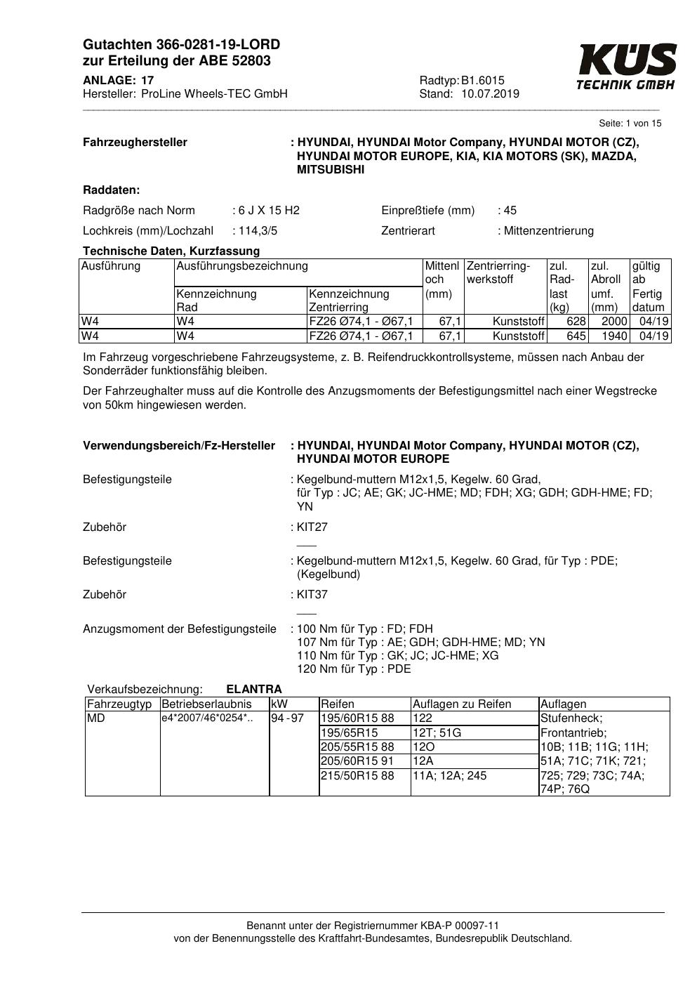 Felgengutachten / ABE für Alufelgen Proline B1.6015 (6Jx15 ET 0, Mittenloch 0 mm) mit KBA 52803 (Zertifikatsnummer KBA 52803). Hier kostenlos als PDF herunterladen. Der Download-Link ist 24 Stunden gültig und kann bis zu zwei Mal verwendet werden.