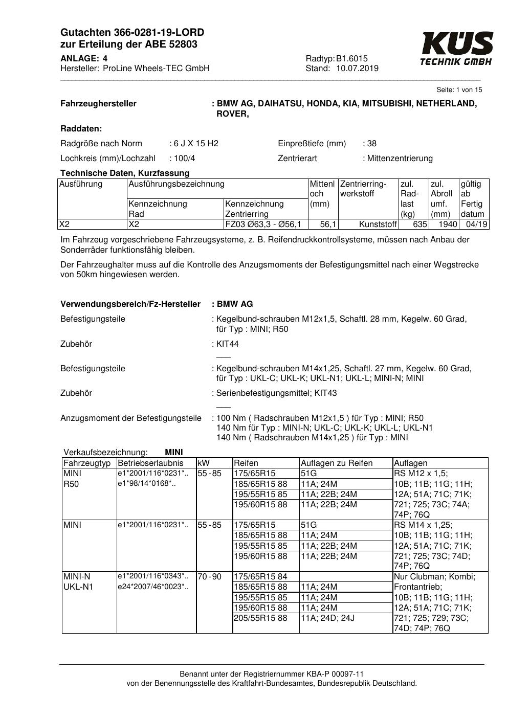 Felgengutachten / ABE für Alufelgen Proline B1.6015 (6Jx15 ET 0, Mittenloch 0 mm) mit KBA 52803 (Zertifikatsnummer KBA 52803). Hier kostenlos als PDF herunterladen. Der Download-Link ist 24 Stunden gültig und kann bis zu zwei Mal verwendet werden.