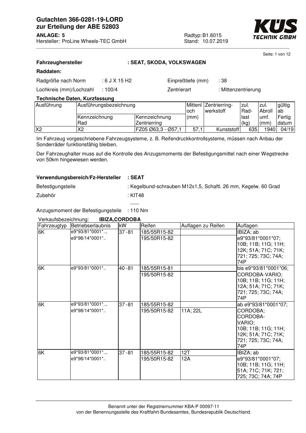 Felgengutachten / ABE für Alufelgen Proline B1.6015 (6Jx15 ET 0, Mittenloch 0 mm) mit KBA 52803 (Zertifikatsnummer KBA 52803). Hier kostenlos als PDF herunterladen. Der Download-Link ist 24 Stunden gültig und kann bis zu zwei Mal verwendet werden.