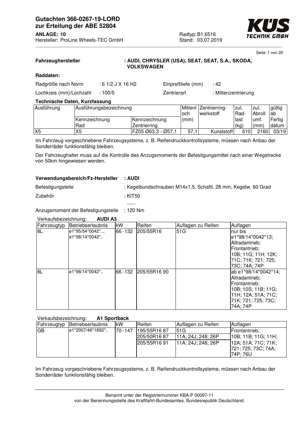 Felgengutachten / ABE für Alufelgen Proline B1.6516 (6.5Jx16 ET 0, Mittenloch 0 mm) mit KBA 52804 (Zertifikatsnummer KBA 52804). Hier kostenlos als PDF herunterladen. Der Download-Link ist 24 Stunden gültig und kann bis zu zwei Mal verwendet werden.