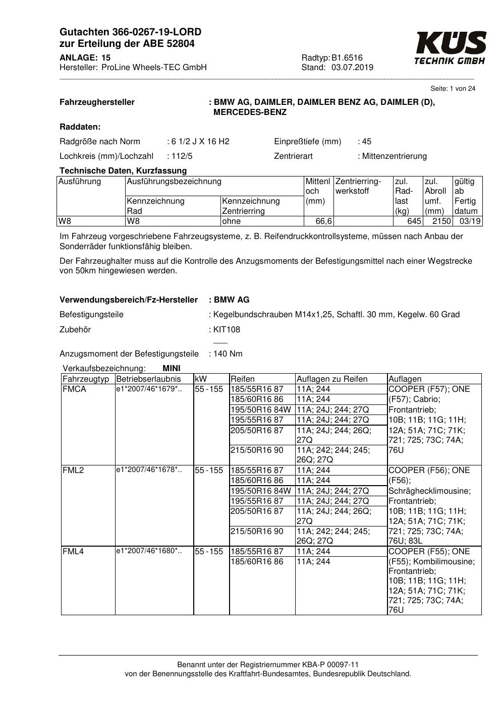 Felgengutachten / ABE für Alufelgen Proline B1.6516 (6.5Jx16 ET 0, Mittenloch 0 mm) mit KBA 52804 (Zertifikatsnummer KBA 52804). Hier kostenlos als PDF herunterladen. Der Download-Link ist 24 Stunden gültig und kann bis zu zwei Mal verwendet werden.