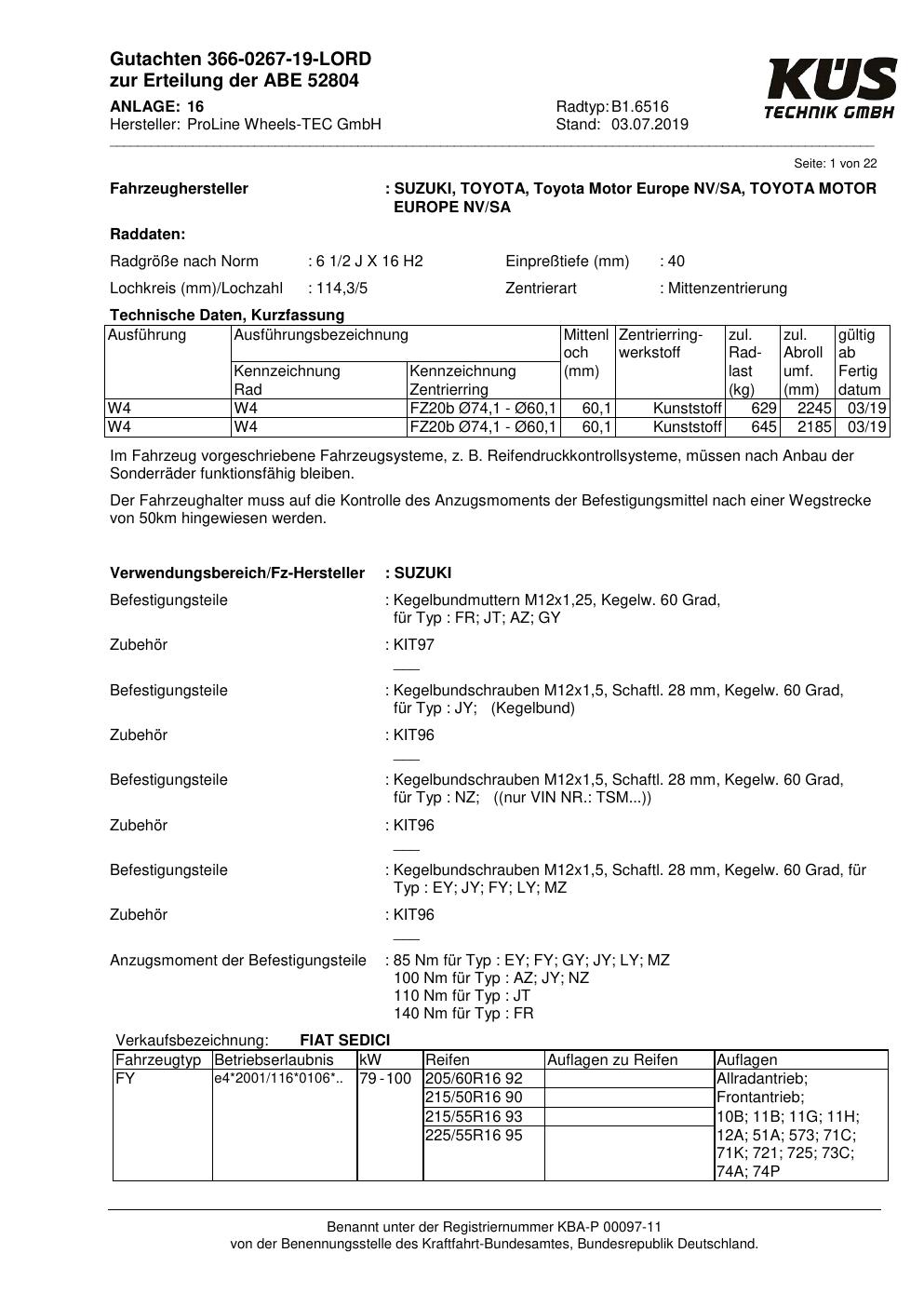 Dieses Gutachten (ABE) bezieht sich auf die Alufelge Proline B1.6516 in der Ausführung 6.5Jx16 ET 0, Mittenloch 0 mm (KBA 52804). Im PDF findest du typischerweise zulässige Reifengrößen, Auflagen/Anbauhinweise und – je nach Dokument – Hinweise zur Eintragung.