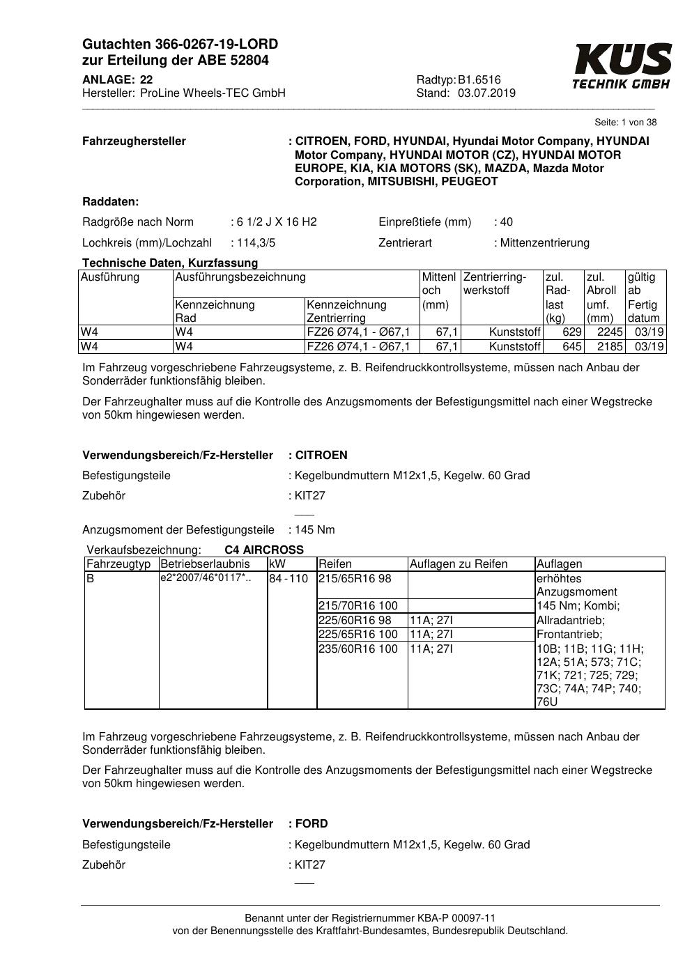Felgengutachten / ABE für Alufelgen Proline B1.6516 (6.5Jx16 ET 0, Mittenloch 0 mm) mit KBA 52804 (Zertifikatsnummer KBA 52804). Hier kostenlos als PDF herunterladen. Der Download-Link ist 24 Stunden gültig und kann bis zu zwei Mal verwendet werden.