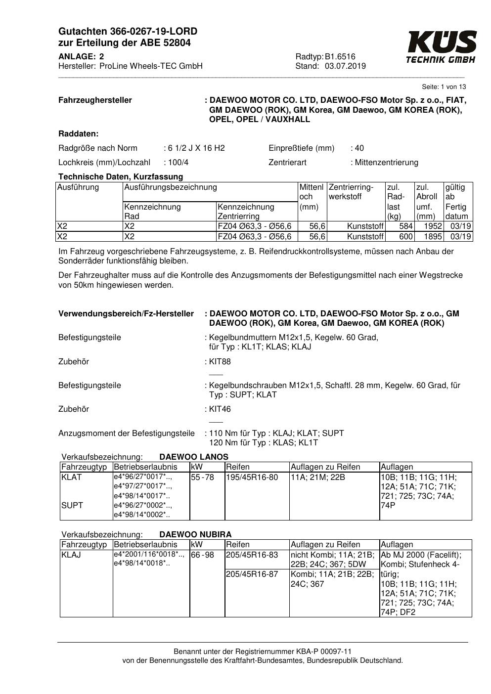 Felgengutachten / ABE für Alufelgen Proline B1.6516 (6.5Jx16 ET 0, Mittenloch 0 mm) mit KBA 52804 (Zertifikatsnummer KBA 52804). Hier kostenlos als PDF herunterladen. Der Download-Link ist 24 Stunden gültig und kann bis zu zwei Mal verwendet werden.
