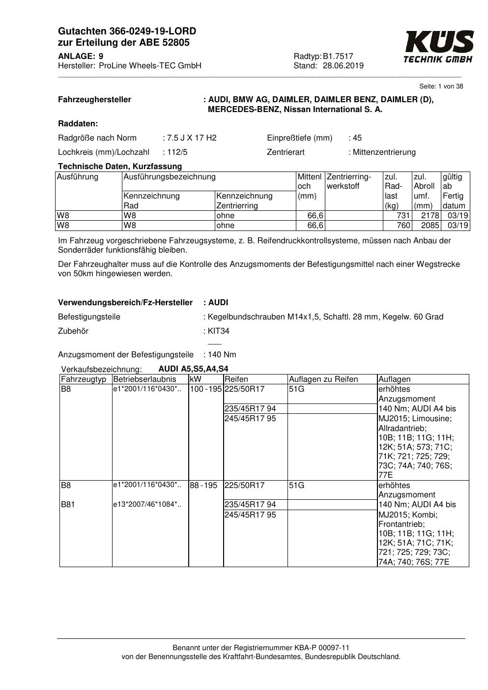Dieses Gutachten (ABE) bezieht sich auf die Alufelge Proline B1.7517 in der Ausführung 7.5Jx17 ET 0, Mittenloch 0 mm (KBA 52805). Im PDF findest du typischerweise zulässige Reifengrößen, Auflagen/Anbauhinweise und – je nach Dokument – Hinweise zur Eintragung.