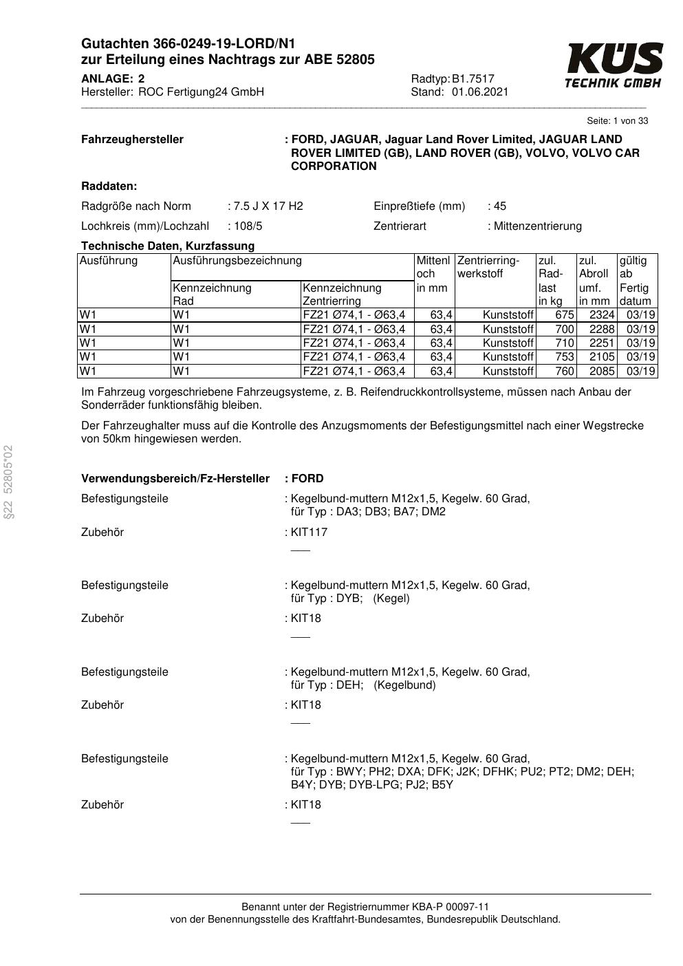 Dieses Gutachten (ABE) bezieht sich auf die Alufelge Proline B1.7517 in der Ausführung 7.5Jx17 ET 0, Mittenloch 0 mm (KBA 52805). Im PDF findest du typischerweise zulässige Reifengrößen, Auflagen/Anbauhinweise und – je nach Dokument – Hinweise zur Eintragung.