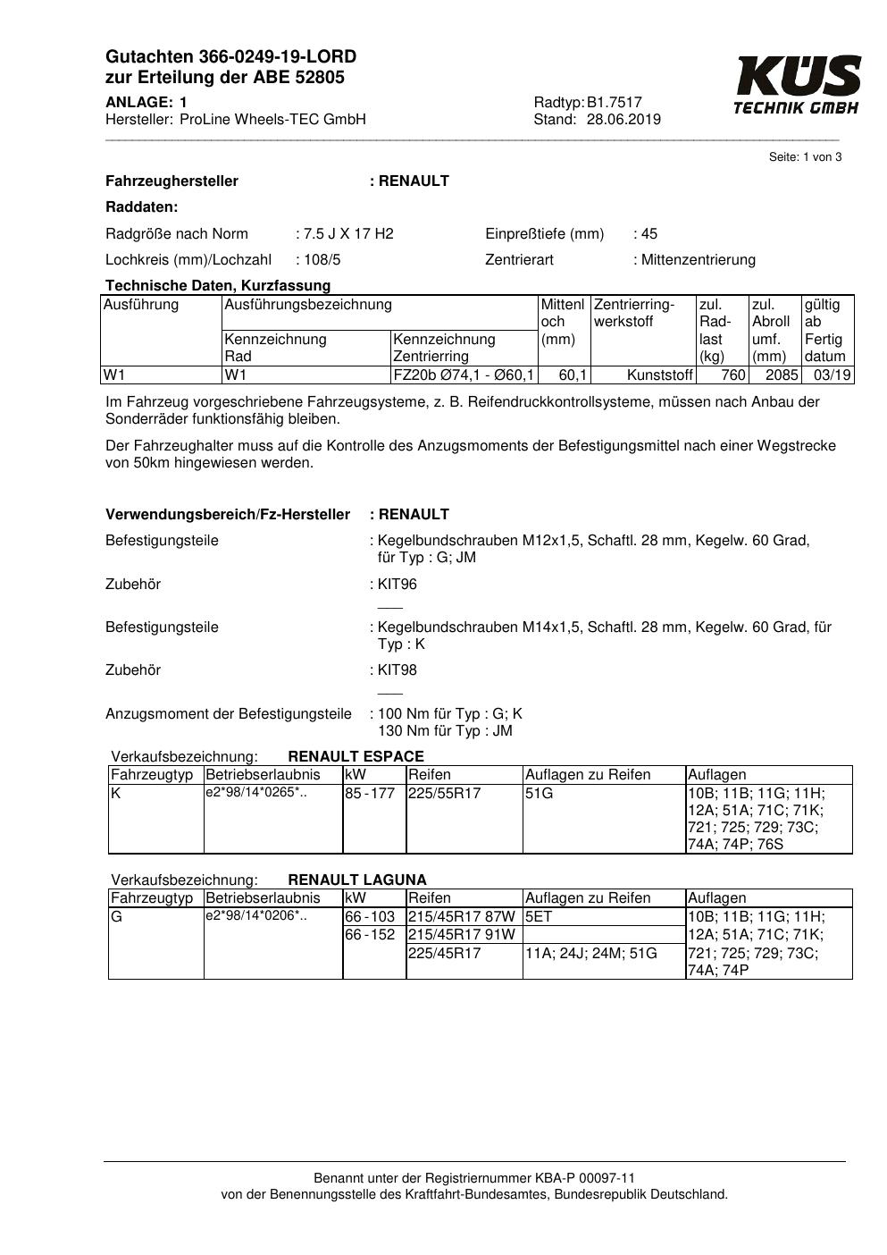 Felgengutachten / ABE für Alufelgen Proline B1.7517 (7.5Jx17 ET 0, Mittenloch 0 mm) mit KBA 52805 (Zertifikatsnummer KBA 52805). Hier kostenlos als PDF herunterladen. Der Download-Link ist 24 Stunden gültig und kann bis zu zwei Mal verwendet werden.