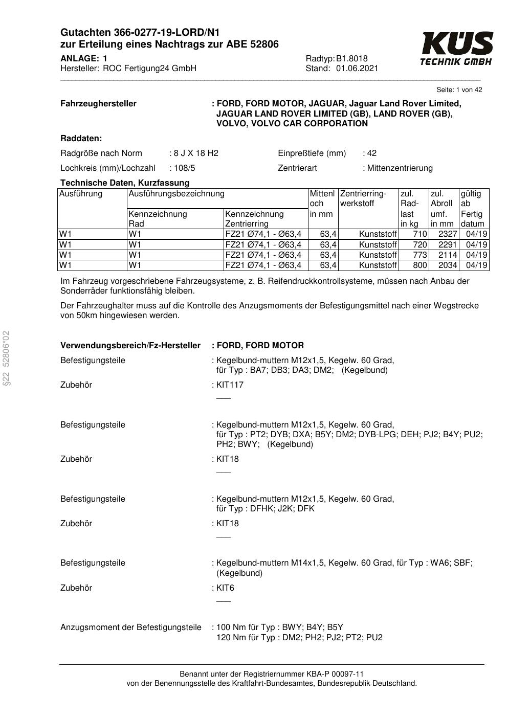 Felgengutachten / ABE für Alufelgen Proline B1.8018 (8Jx18 ET 0, Mittenloch 0 mm) mit KBA 52806 (Zertifikatsnummer KBA 52806). Hier kostenlos als PDF herunterladen. Der Download-Link ist 24 Stunden gültig und kann bis zu zwei Mal verwendet werden.