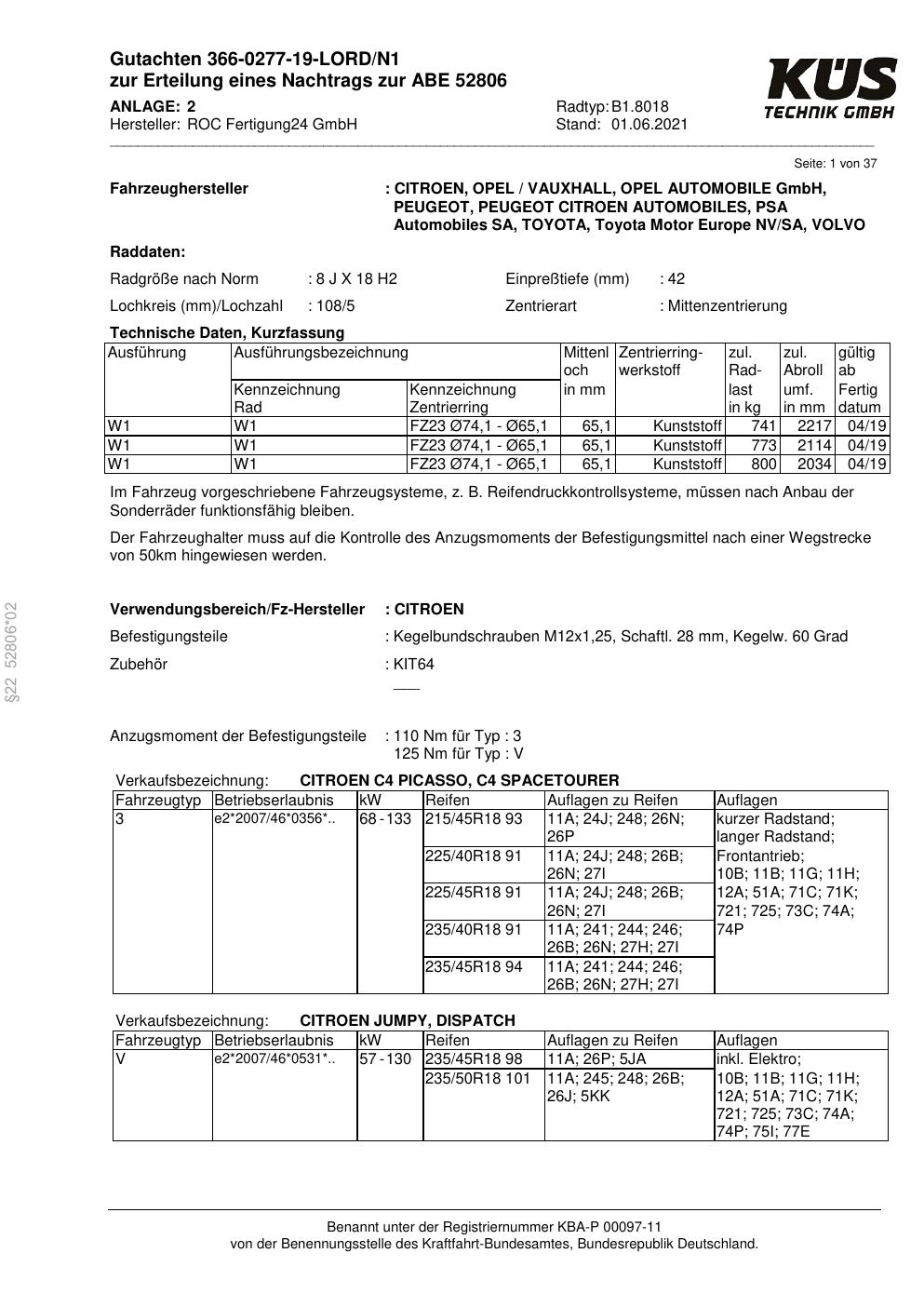 Dieses Gutachten (ABE) bezieht sich auf die Alufelge Proline B1.8018 in der Ausführung 8Jx18 ET 0, Mittenloch 0 mm (KBA 52806). Im PDF findest du typischerweise zulässige Reifengrößen, Auflagen/Anbauhinweise und – je nach Dokument – Hinweise zur Eintragung.