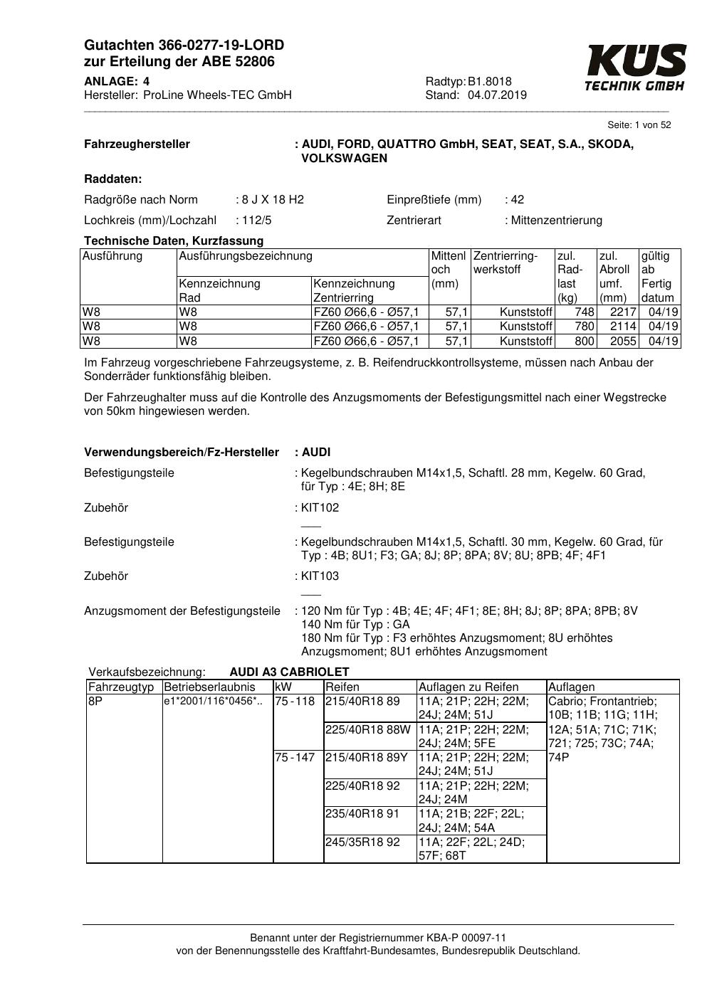 Dieses ABE gehört zur Felge Proline B1.8018 in 8Jx18 ET0 mit KBA 52806. Die Seite ist dafür gedacht, dass du schnell prüfen kannst, ob KBA, Design und Größe zu deiner Felge passen und danach direkt das richtige PDF lädst.