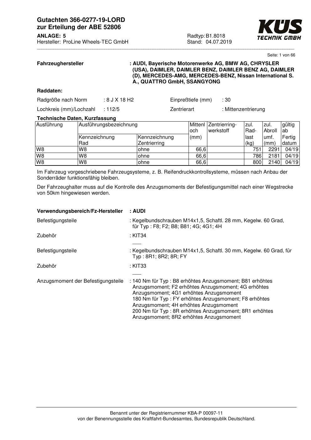 Felgengutachten / ABE für Alufelgen Proline B1.8018 (8Jx18 ET 0, Mittenloch 0 mm) mit KBA 52806 (Zertifikatsnummer KBA 52806). Hier kostenlos als PDF herunterladen. Der Download-Link ist 24 Stunden gültig und kann bis zu zwei Mal verwendet werden.