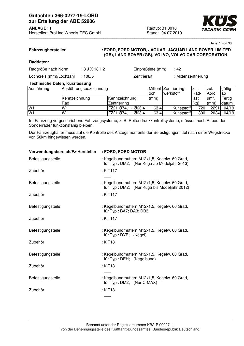 Felgengutachten / ABE für Alufelgen Proline B1.8018 (8Jx18 ET 0, Mittenloch 0 mm) mit KBA 52806 (Zertifikatsnummer KBA 52806). Hier kostenlos als PDF herunterladen. Der Download-Link ist 24 Stunden gültig und kann bis zu zwei Mal verwendet werden.
