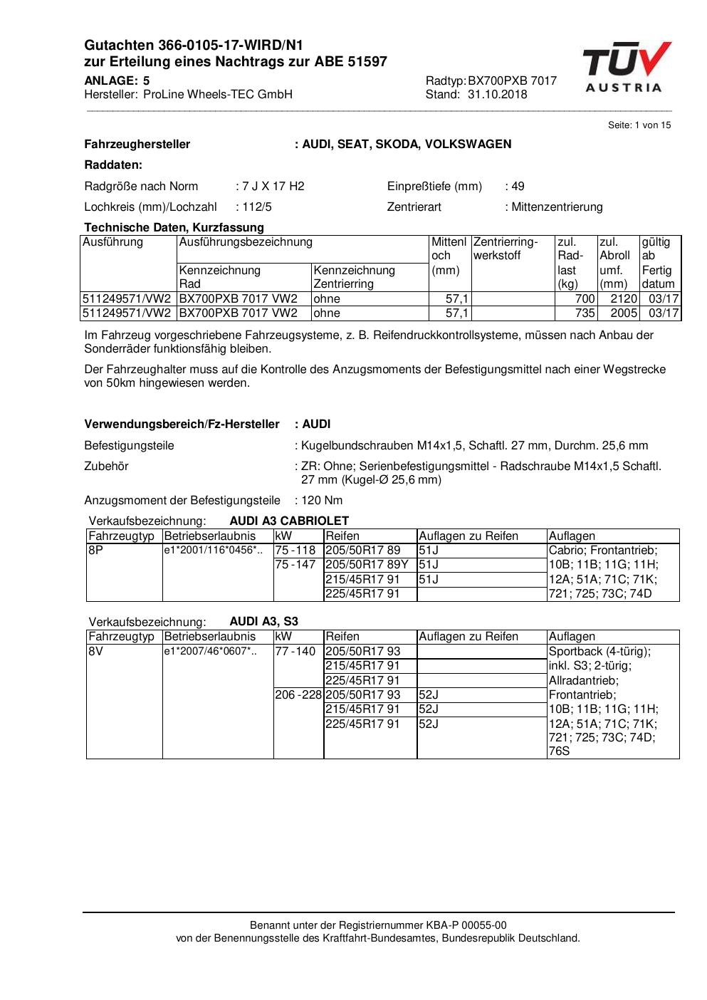 Felgengutachten / ABE für Alufelgen Proline BX700PXB.7017 (7Jx17 ET 0, Mittenloch 0 mm) mit KBA 51597 (Zertifikatsnummer KBA 51597). Hier kostenlos als PDF herunterladen. Der Download-Link ist 24 Stunden gültig und kann bis zu zwei Mal verwendet werden.
