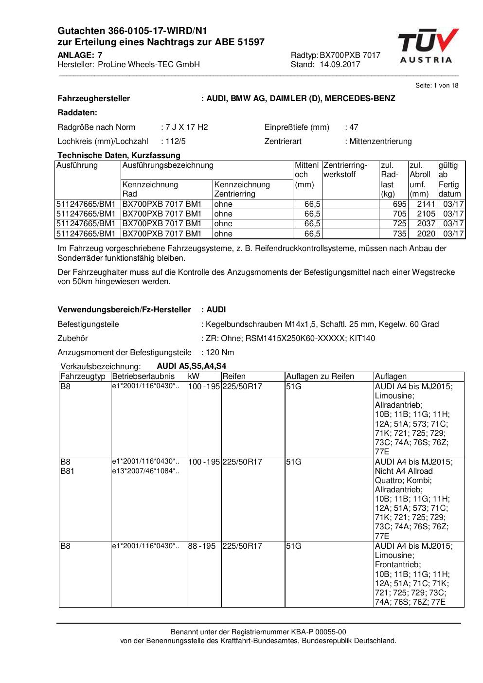 Felgengutachten / ABE für Alufelgen Proline BX700PXB.7017 (7Jx17 ET 0, Mittenloch 0 mm) mit KBA 51597 (Zertifikatsnummer KBA 51597). Hier kostenlos als PDF herunterladen. Der Download-Link ist 24 Stunden gültig und kann bis zu zwei Mal verwendet werden.