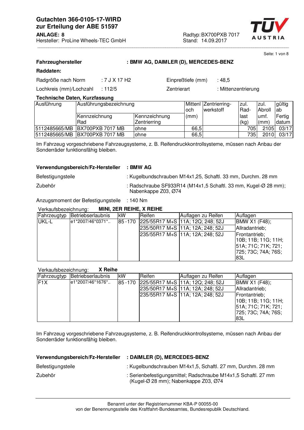 Felgengutachten / ABE für Alufelgen Proline BX700PXB.7017 (7Jx17 ET 0, Mittenloch 0 mm) mit KBA 51597 (Zertifikatsnummer KBA 51597). Hier kostenlos als PDF herunterladen. Der Download-Link ist 24 Stunden gültig und kann bis zu zwei Mal verwendet werden.