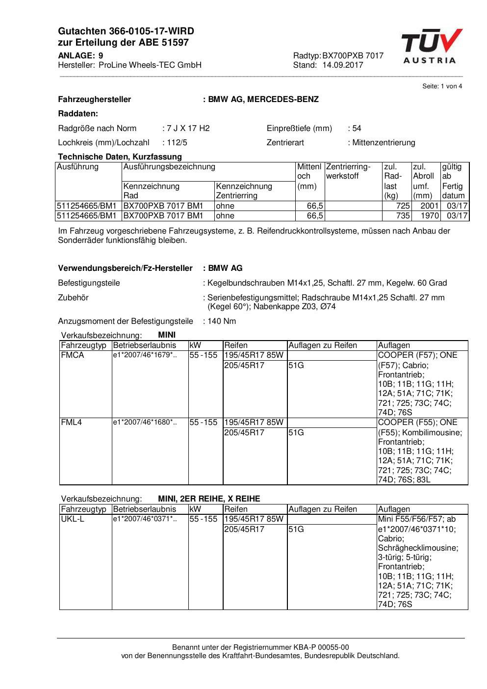 Felgengutachten / ABE für Alufelgen Proline BX700PXB.7017 (7Jx17 ET 0, Mittenloch 0 mm) mit KBA 51597 (Zertifikatsnummer KBA 51597). Hier kostenlos als PDF herunterladen. Der Download-Link ist 24 Stunden gültig und kann bis zu zwei Mal verwendet werden.