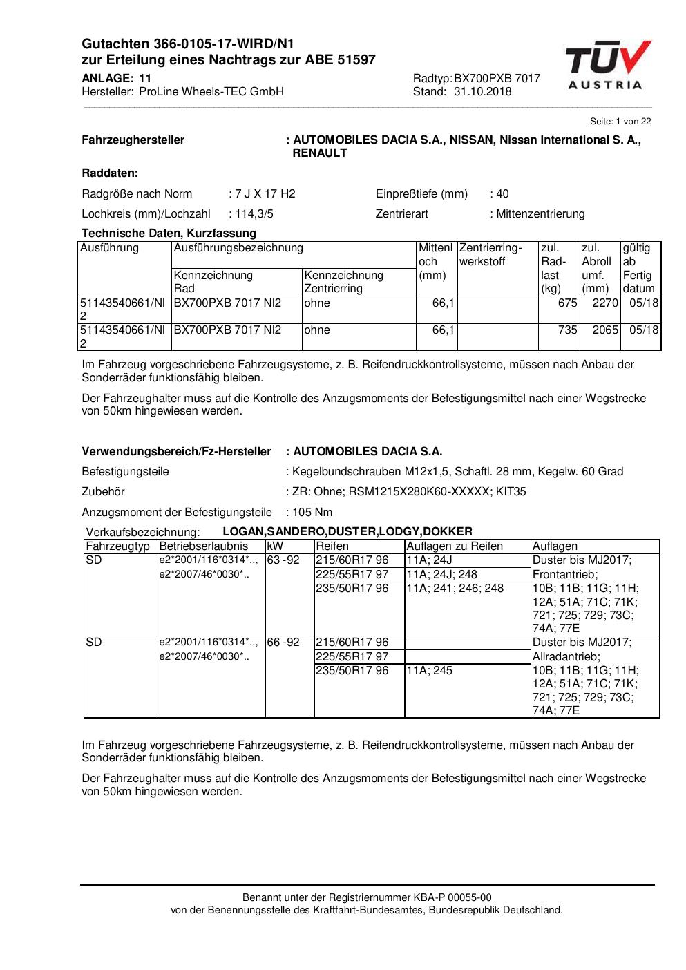Felgengutachten / ABE für Alufelgen Proline BX700PXB.7017 (7Jx17 ET 0, Mittenloch 0 mm) mit KBA 51597 (Zertifikatsnummer KBA 51597). Hier kostenlos als PDF herunterladen. Der Download-Link ist 24 Stunden gültig und kann bis zu zwei Mal verwendet werden.