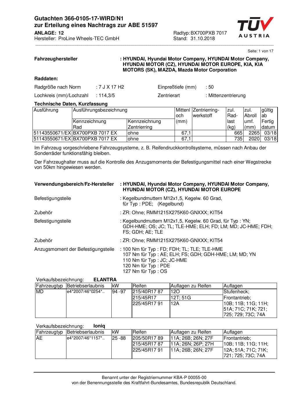Dieses Gutachten (ABE) bezieht sich auf die Alufelge Proline BX700PXB.7017 in der Ausführung 7Jx17 ET 0, Mittenloch 0 mm (KBA 51597). Im PDF findest du typischerweise zulässige Reifengrößen, Auflagen/Anbauhinweise und – je nach Dokument – Hinweise zur Eintragung.