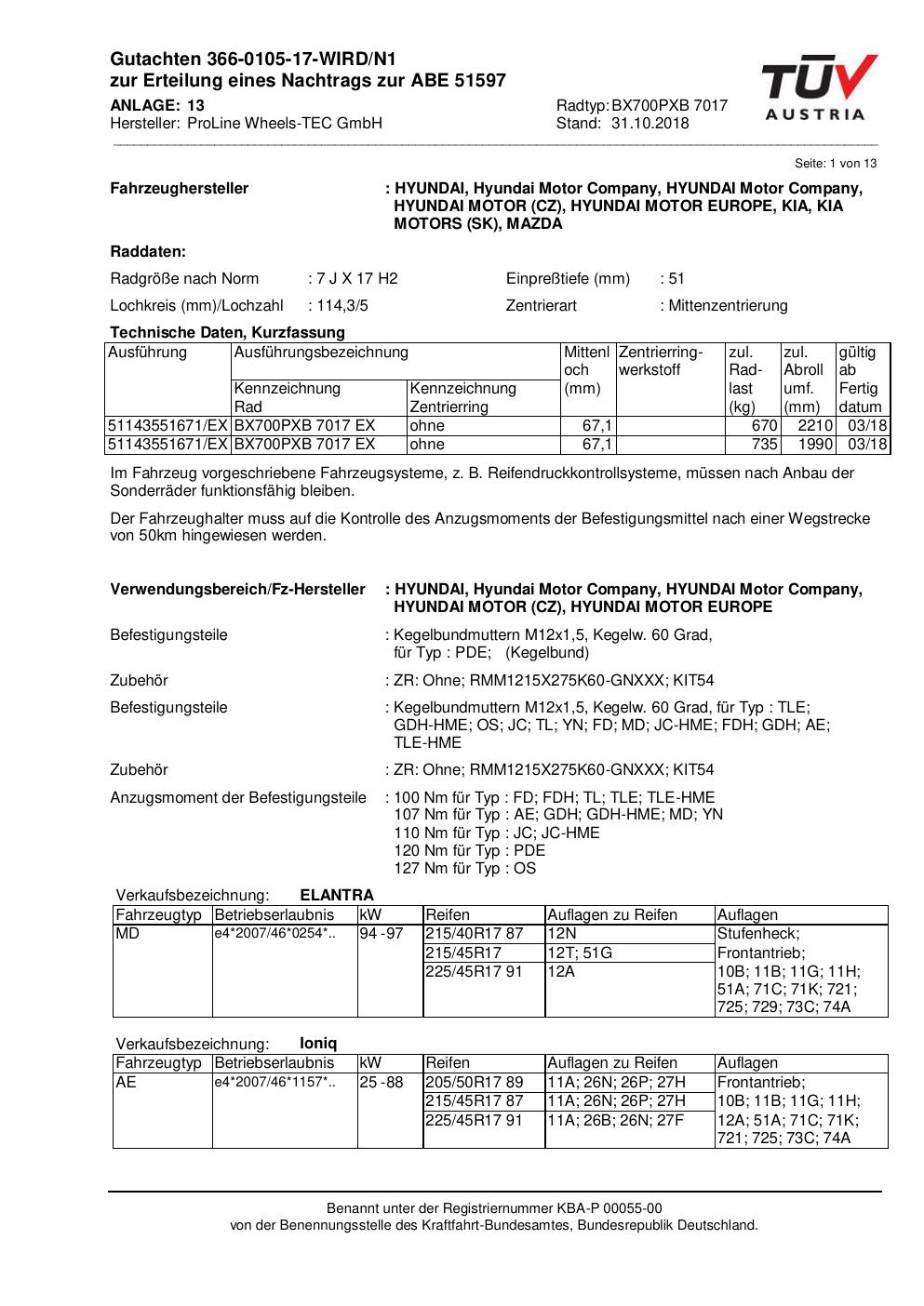 Dieses Gutachten (ABE) bezieht sich auf die Alufelge Proline BX700PXB.7017 in der Ausführung 7Jx17 ET 0, Mittenloch 0 mm (KBA 51597). Im PDF findest du typischerweise zulässige Reifengrößen, Auflagen/Anbauhinweise und – je nach Dokument – Hinweise zur Eintragung.