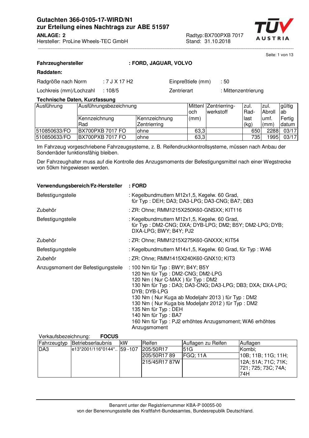 Dieses Gutachten (ABE) bezieht sich auf die Alufelge Proline BX700PXB.7017 in der Ausführung 7Jx17 ET 0, Mittenloch 0 mm (KBA 51597). Im PDF findest du typischerweise zulässige Reifengrößen, Auflagen/Anbauhinweise und – je nach Dokument – Hinweise zur Eintragung.