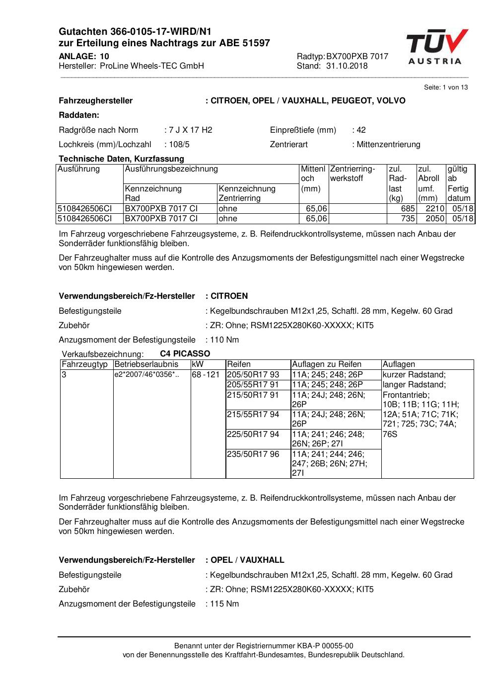 Dieses Gutachten (ABE) bezieht sich auf die Alufelge Proline BX700PXB.7017 in der Ausführung 7Jx17 ET 0, Mittenloch 0 mm (KBA 51597). Im PDF findest du typischerweise zulässige Reifengrößen, Auflagen/Anbauhinweise und – je nach Dokument – Hinweise zur Eintragung.