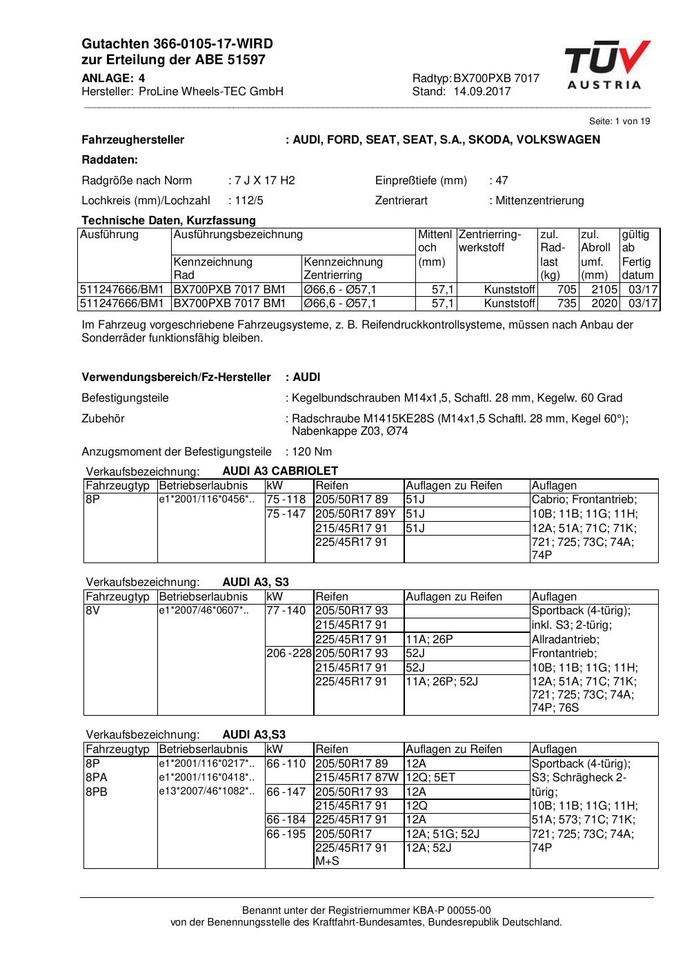Dieses Gutachten (ABE) bezieht sich auf die Alufelge Proline BX700PXB.7017 in der Ausführung 7Jx17 ET 0, Mittenloch 0 mm (KBA 51597). Im PDF findest du typischerweise zulässige Reifengrößen, Auflagen/Anbauhinweise und – je nach Dokument – Hinweise zur Eintragung.